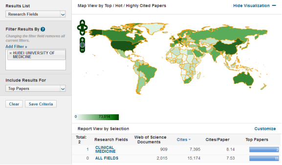 我校临床医学科有909篇论文(Web of Science 核心合集中的2个索引SCI-E和SSCI收录的上述时间范围内article和review类型的论文数),总被引频次是7395次(在Web of Science 核心合集中的3个索引 SCI-E/SSCI/A&HCI的被引用次数),篇均被引频次8.14,高水平论文2篇。