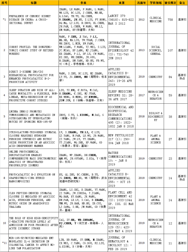本期我校11篇高水平论文(见表1)。其中,高被引论文10篇,热点论文2篇。