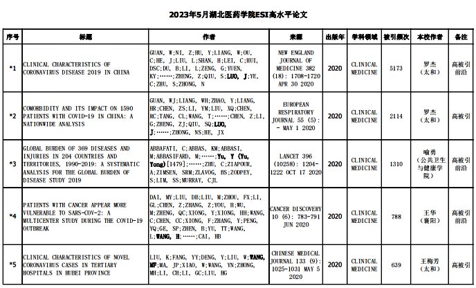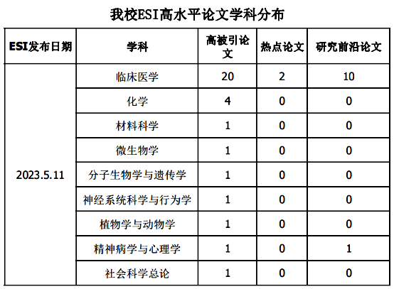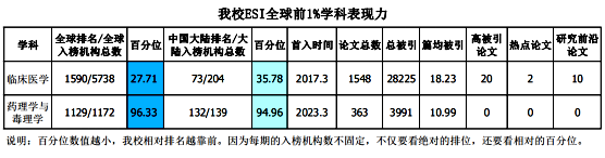 本期,我校有2个学科进入 ESI(全球前 1%),为临床医学(Clinical Medicine)与药理学与毒理学(Pharmacology & Toxicology)。