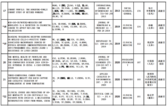 本期,临床医学全球入榜机构总数5738个,我校排名1590,与上期相比下降160位,中国大陆入榜机构总数204个,我校排名73,与上期相比下降12位。被ESI收录的论文总数为1548篇(Web of Science核心合集的SCI-E/SSCI中收录的上述时间范围内ARTICLE和REVIEW类型的论文数),被引频次总计28225次(在Web of Science核心合集的SCI-E/SSCI/A&HCI中的被引用次数),篇均被引频次18.23,高水平论文20篇。其中,高被引论文20篇,热点论文2篇,研究前沿论文10篇。