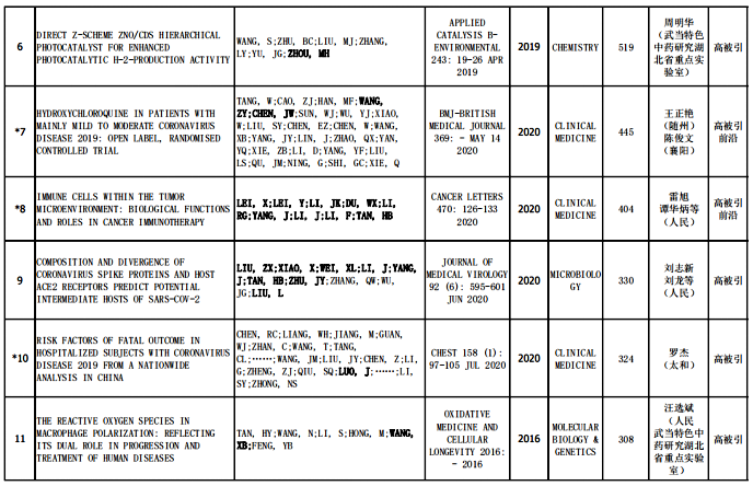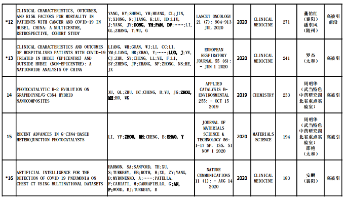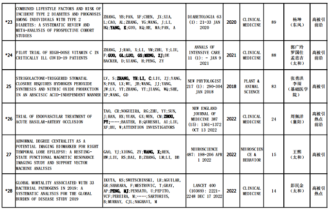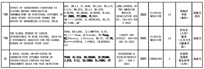 本期ESI数据显示,我校高水平论文涉及9个ESI学科,共31篇。其中,高被引论文31篇,临床医学最多,为20篇,其次是化学,为4篇;热点论文2篇,均为临床医学;前沿论文11篇,临床医学最多,为10篇,其余1篇为精神病学与心理学。如下所示: