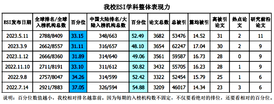 据2023年5月11日发布的最新一期ESI数据,本期全球入榜机构总数8409个,我校排名2788,与上期相比下降126位,中国大陆入榜机构总数663个,我校排名348,与上期相比下降32位。