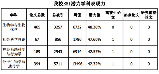 对未进入ESI全球被引排名前1%的学科,结合ESI与InCites的数据,应用合理的算法预测其潜力值,对学科规划与发展非常重要。只有潜力值超过100%时,才有可能进入ESI,潜力值越大希望越大。根据ESI 2023年5月、InCites 2023年4月的最新数据,本期我校各学科进入ESI全球前1%的潜力值排名,较靠前的4个学科为:生物学与生物化学、社会科学总论、神经系统科学与行为学、分子生物学与遗传学。表现力如下所示:
