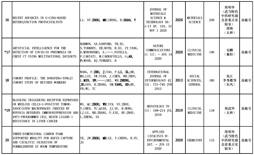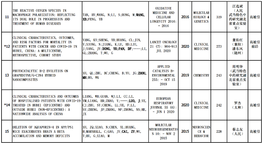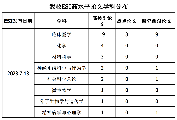 本期我校被ESI收录的论文总数为3773篇(Web of Science 核心合集的SCI-E/SSCI中收录的上述时间范围ARTICLE和REVIEW类型的论文数),被引频次总计60235次(在Web of Science 核心合集的SCI-E/SSCI/A&HCI中的被引用次数),篇均被引频次15.96,高水平论文33篇。其中,高被引论文33篇,热点论文3篇,研究前沿论文12篇。
