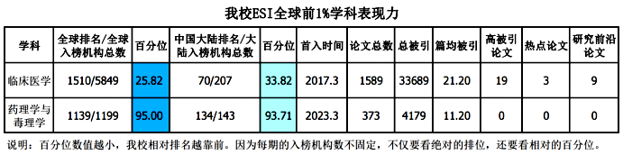 本期,我校有2个学科进入 ESI(全球前 1%),为临床医学(ClinicalMedicine)、药理学与毒理学(Pharmacology & Toxicology)。