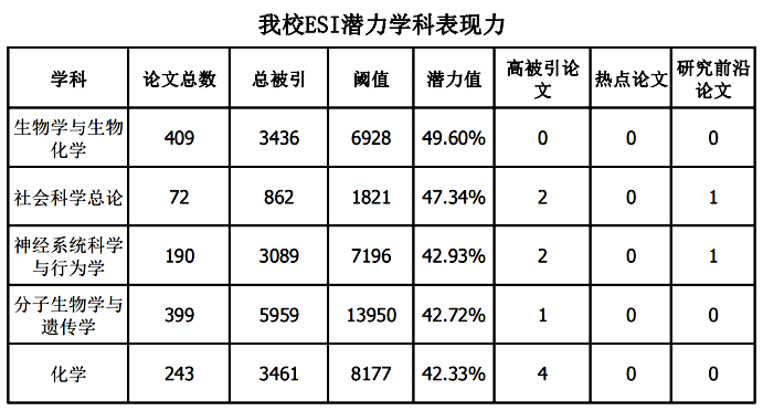 对未进入ESI全球被引排名前1%的学科,结合ESI与InCites的数据,应用合理的算法预测其潜力值,对学科规划与发展非常重要。只有潜力值超过100%时,才有可能进入ESI,潜力值越大希望越大。根据ESI2023年7月、InCites 2023年6月的最新数据,本期我校各学科进入ESI全球前1%的潜力值排名,较靠前的5个学科为:生物学与生物化学(本期49.60%,上期48.38%)、社会科学总论(本期47,34%,上期47.66%)、神经系统科学与行为学(本期42.93%,上期42.57%)、分子生物学与遗传学(本期42.72%,上期42.32%)、化学(本期42.33%,上期40.17%)。表现力如下所示: