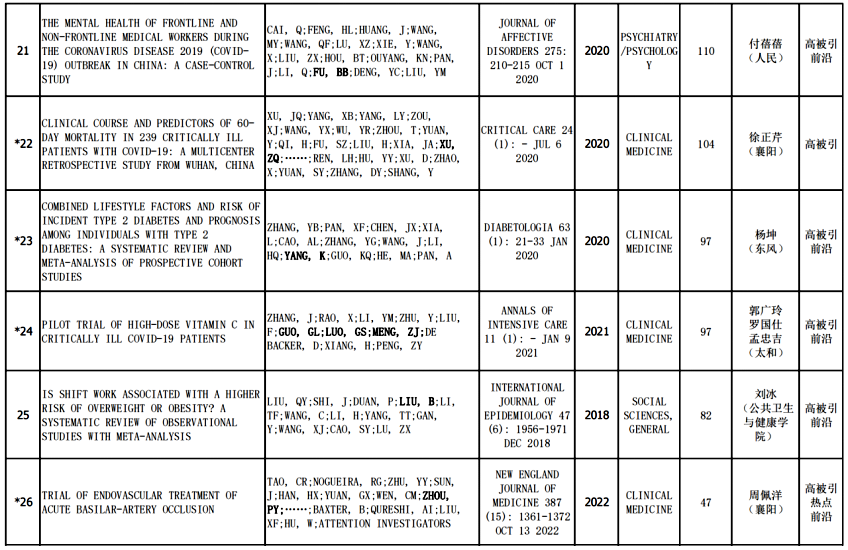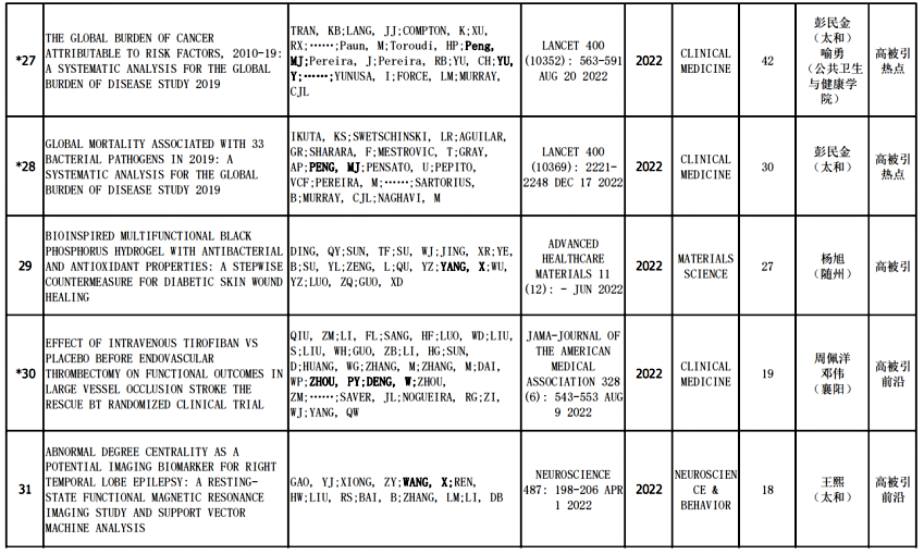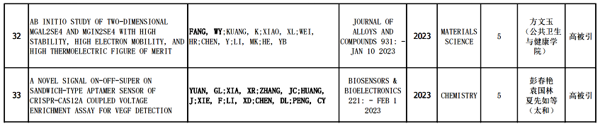 本期ESI数据显示,我校高水平论文涉及8个ESI学科,共33篇。其中,高被引论文33篇,临床医学最多,为19篇,其次是化学,为4篇;热点论文3篇,均为临床医学;前沿论文12篇,临床医学最多,为9篇,其余为神经系统科学与行为学、社会科学总论、精神病学与心理学各1篇。如下所示: