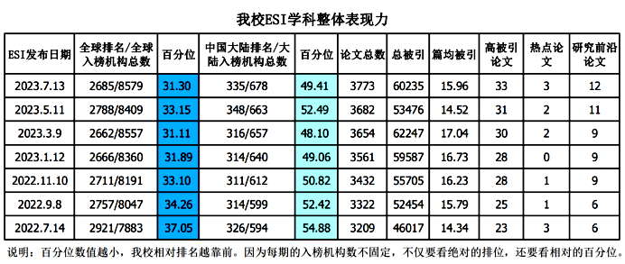 据2023年7月13日发布的最新一期ESI数据,本期全球入榜机构总数8579个,我校排名2685,与上期相比上升103位,百分比排名较上期上升1.85%;中国大陆入榜机构总数678个,我校排名335,与上期相比上升13位,百分比排名较上期上升3.08%。
