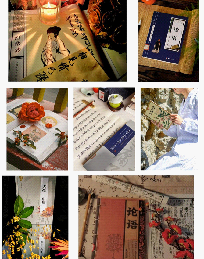 活动要求学生在图书馆借阅一本国学经典书籍,结合标题内容打造一个深入人心的场景,将书本融入到场景进行拍摄,营造美感并切合书本的主题和内容。同学们充分发挥想象力,通过个人理解将国学经典与外界景色相融合,达到书与景的统一,透过一张张图片,或明或暗、或浓或淡 ,无不展现出学生们的观察力、创造力和审美能力。