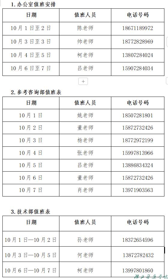 1.各部门做好开放服务值班安排。图书馆带岗值班人员值班当日不得离开市区,保证电话24小时畅通,坚持实行“日报告”“零报告”制度。