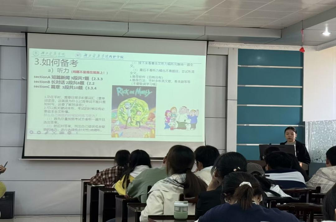 主讲人分别从听力、阅读、写作和翻译四个模块入手,详细介绍了自己的备考策略、时间管理方法和应试技巧。其中,胡滢同学重点分享了单词记忆和翻译技巧,向大家推荐了实用的英语学习软件和书籍;柯沛含同学则重点分享了她在阅读写作方面的经验。活动现场还设置了互动环节,同学们纷纷就自己备考中遇到的问题提问,如“如何快速提高词汇量”、“如何把握写作时间”等,现场气氛热烈而融洽。