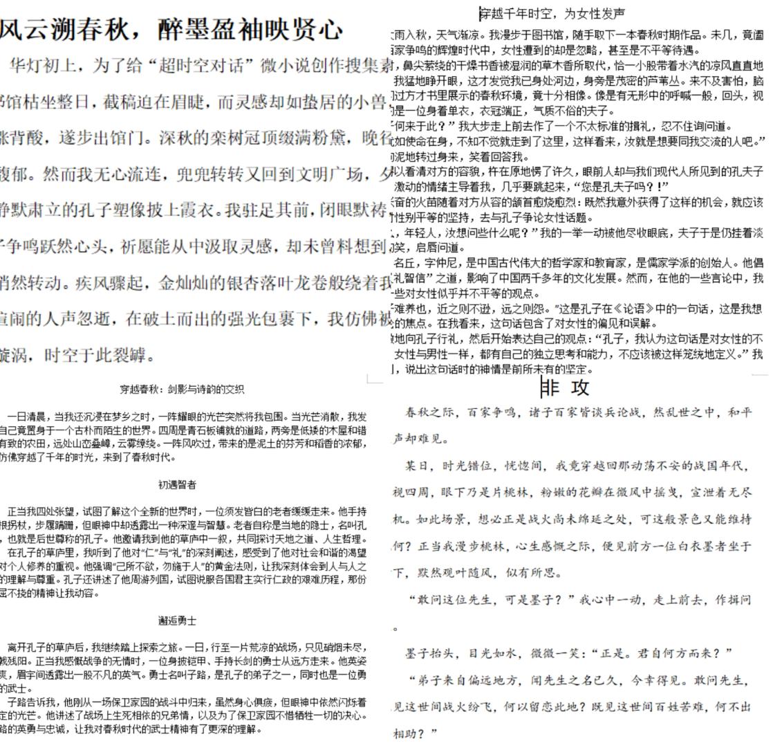 大赛自启动以来,受到了广大学子们的广泛关注与积极参与。参赛者们以春秋时代为背景,用现代的视角创作富有创意和历史深度的微小说作品。这些作品不仅展示了参赛者对春秋时期历史背景、人物形象和故事情节的深入理解,更通过现代文学手法重新诠释了这一历史时期的传奇与变革,参赛者丰富的想象力和出色的写作技巧,让人耳目一新,印象深刻。经过层层筛选,共有数十篇优秀作品脱颖而出。
