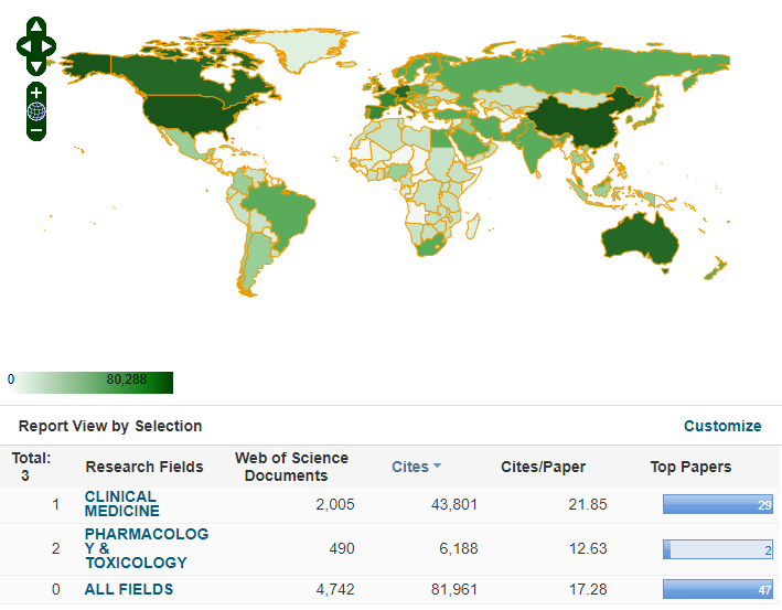 本期,药理学与毒理学全球入榜机构总数1361个,我校排名968,与上期相比上升7位,排名百分位较上期上升1.8%;中国大陆入榜机构总数170个,我校排名126,与上期持平,排名百分位较上期上升0.88%。被ESI收录的论文总数为490篇(Web of Science核心合集的SCI-E/SSCI中收录的上述时间范围内ARTICLE和REVIEW类型的论文数),被引频次总计6188次(在Web of Science核心合集的 SCI-E/SSCI/A&HCI中的被引用次数),篇均被引频次12.63,高水平论文2篇。其中,高被引论文2篇,热点论文0篇,研究前沿论文1篇。表现力如下所示: