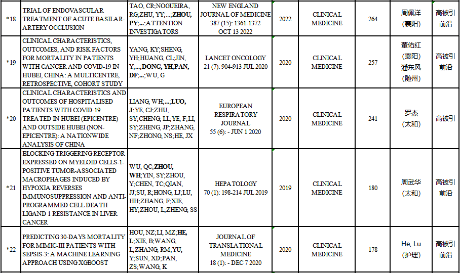 本期,临床医学全球入榜机构总数6619个,我校排名1463,与上期相比下降8位,排名百分位较上期上升0.22%;中国大陆入榜机构总数248个,我校排名70,与上期持平,排名百分位较上期上升0.23%。被ESI收录的论文总数为2005篇(Web of Science核心合集的SCI-E/SSCI中收录的上述时间范围内ARTICLE和REVIEW类型的论文数),被引频次总计43801次(在Web of Science核心合集的SCI-E/SSCI/A&HCI中的被引用次数),篇均被引频次21.85,高水平论文29篇。其中,高被引论文29篇,热点论文2篇,研究前沿论文13篇。表现力如下所示: