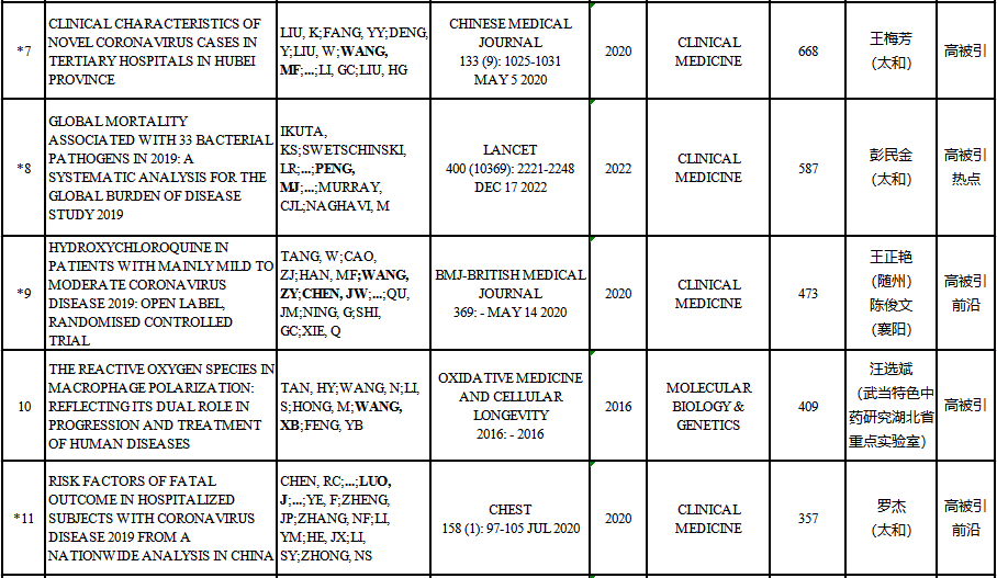 本期我校ESI高水平论文涉及10个ESI学科,共47篇。其中,高被引论文47篇,临床医学最多,为29篇,其次是分子生物学与遗传学、化学、材料科学,各3篇;热点论文2篇,均为临床医学;前沿论文16篇,临床医学最多,为13篇,其次是分子生物学与遗传学、药理学与毒理学、神经系统科学与行为学,各1篇。如下所示: