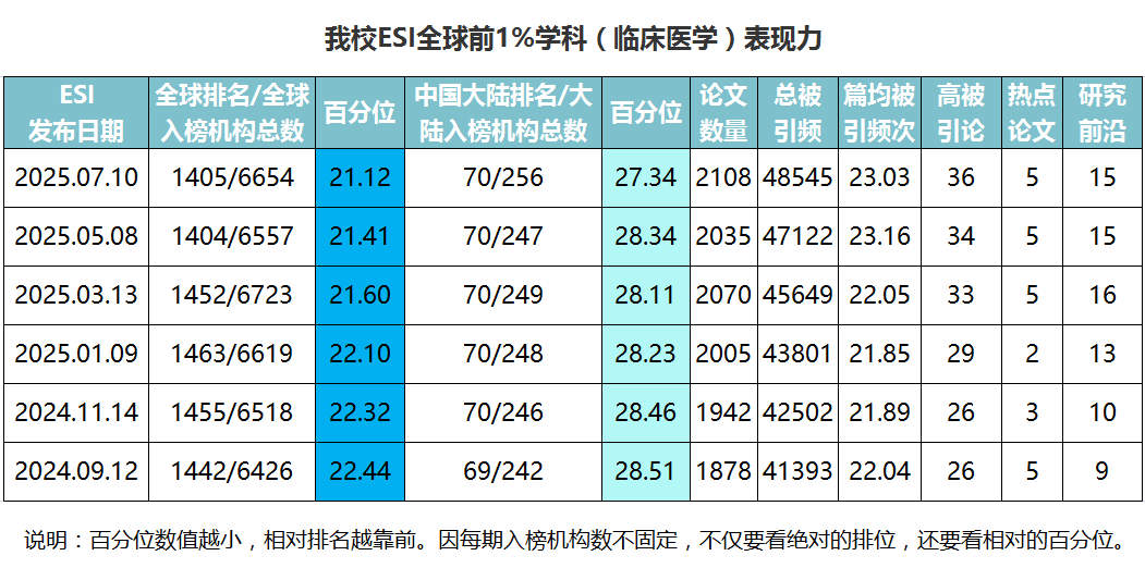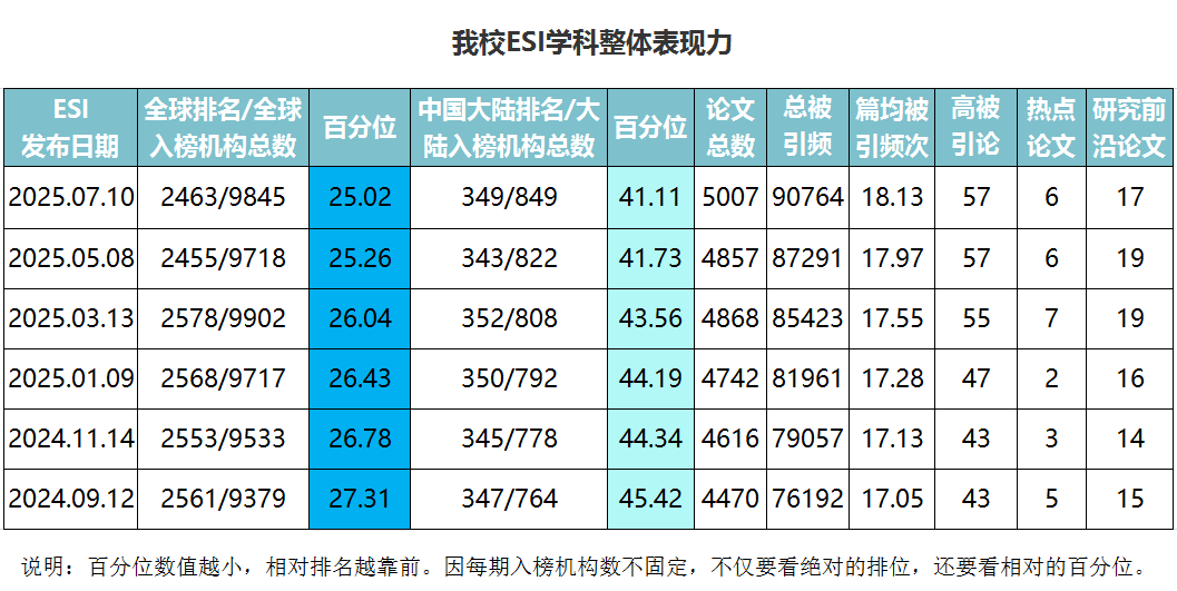 2025年7月10日发布的最新一期ESI数据显示,本期全球入榜机构总数9845个,我校排名2463,与上期相比下降8位,排名百分位较上期上升0.24%;中国大陆入榜机构总数849个,我校排名349,与上期相比下降6位,排名百分位较上期上升0.62%。