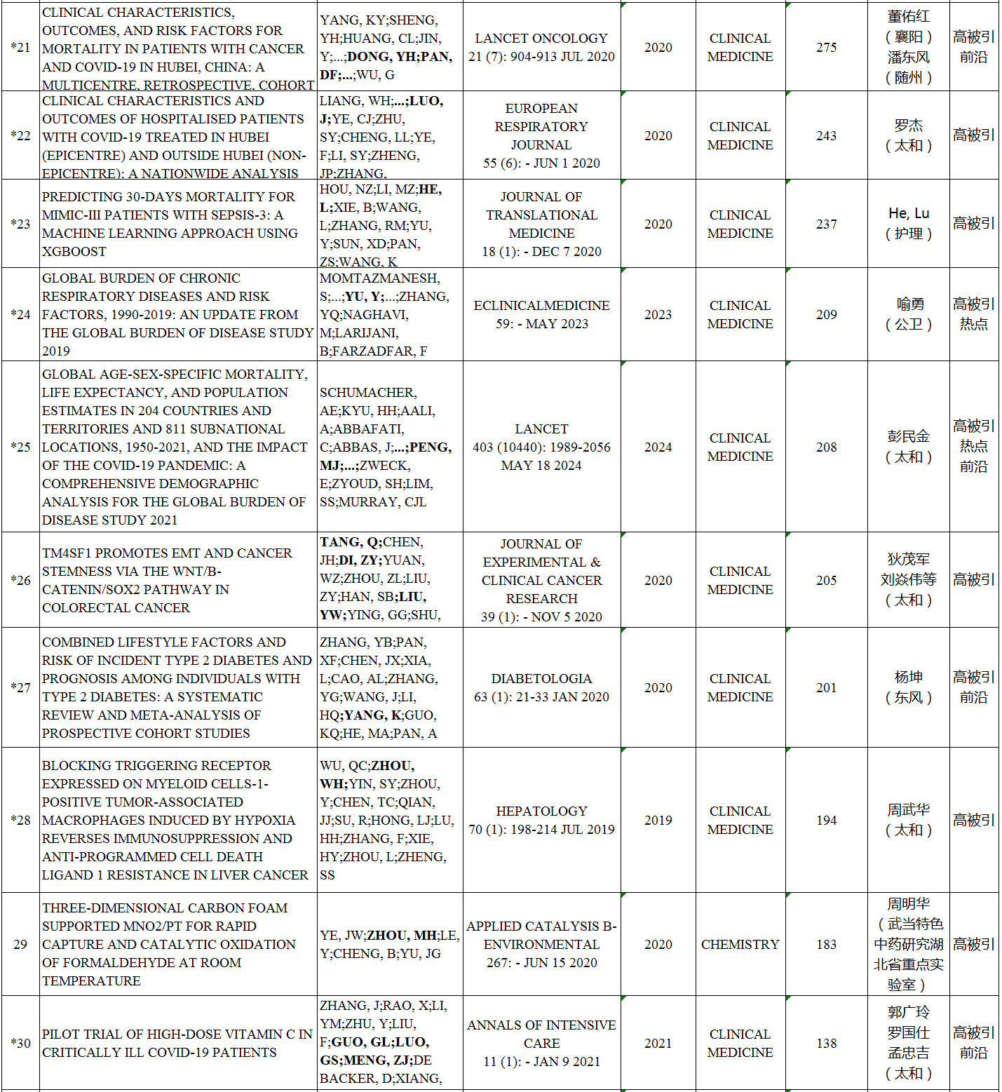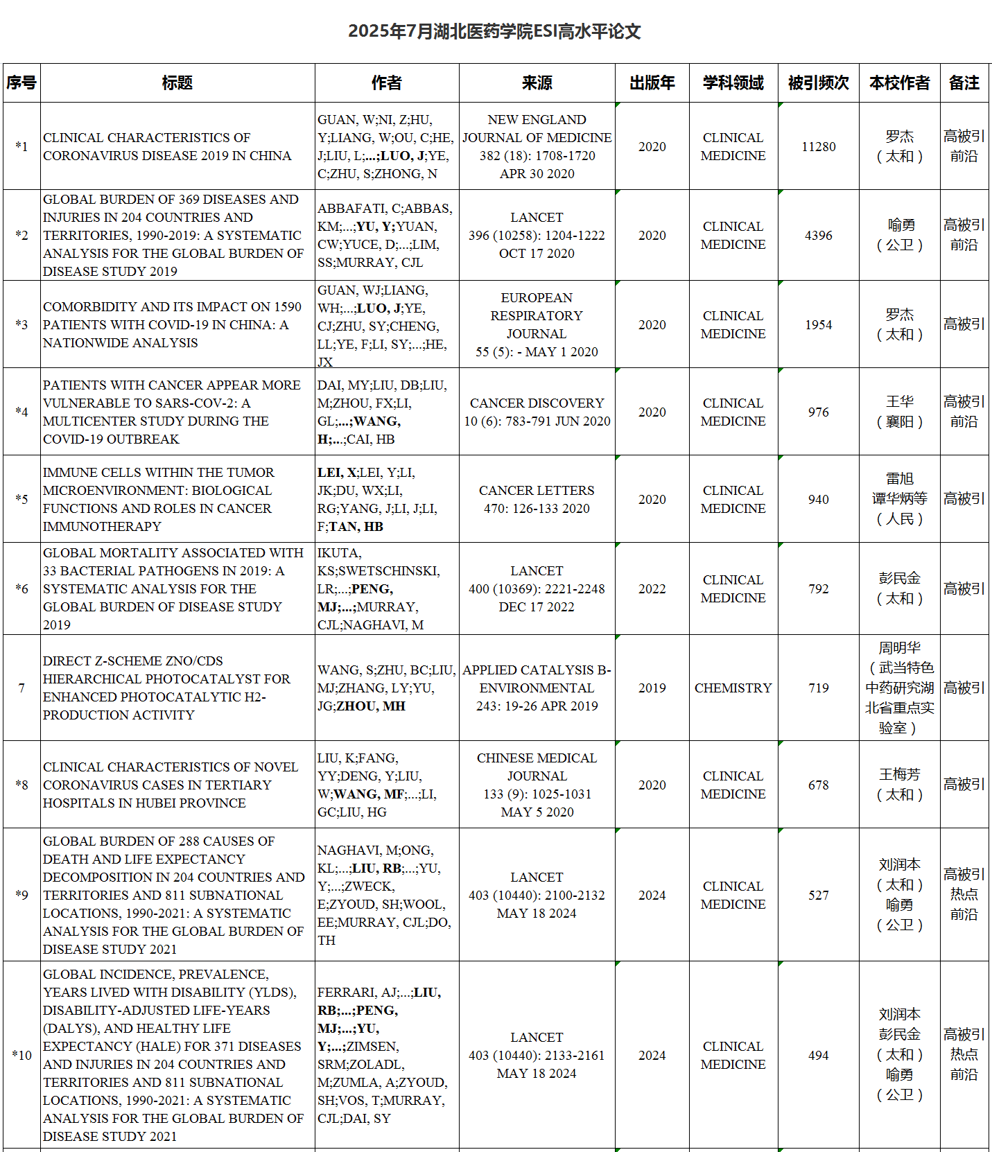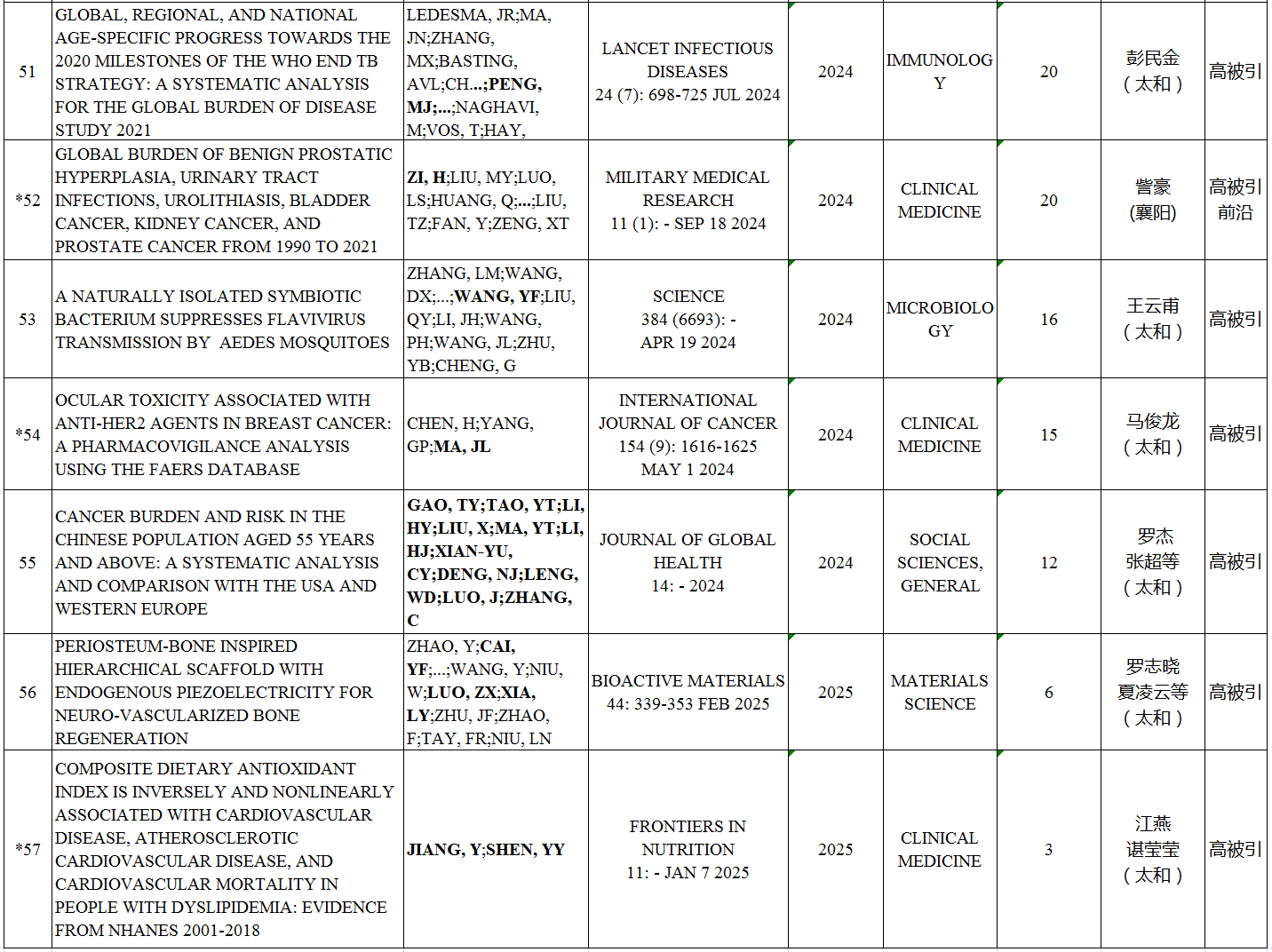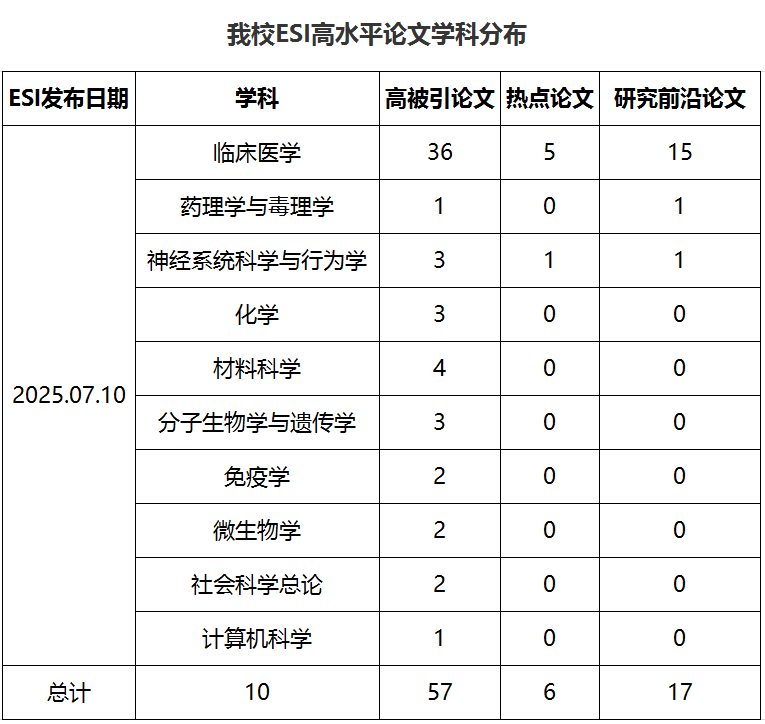 本期我校ESI高水平论文涉及10个ESI学科,共57篇。其中,高被引论文57篇,临床医学最多,为36篇,其次是材料科学,为4篇;热点论文6篇,临床医学5篇,神经系统科学与行为学1篇;研究前沿论文17篇,临床医学15篇,药理学与毒理学1篇,神经系统科学与行为学1篇。如下所示: