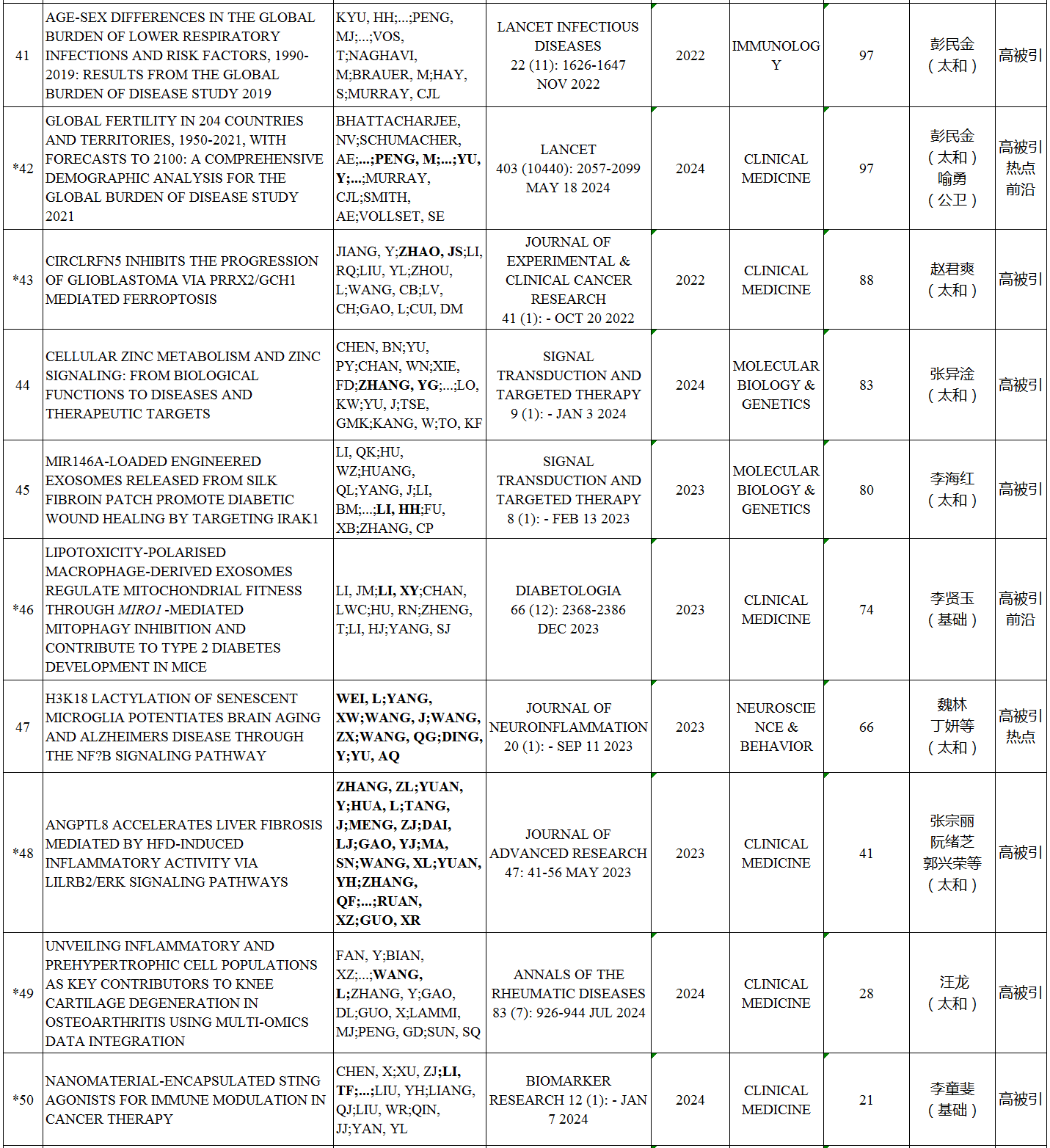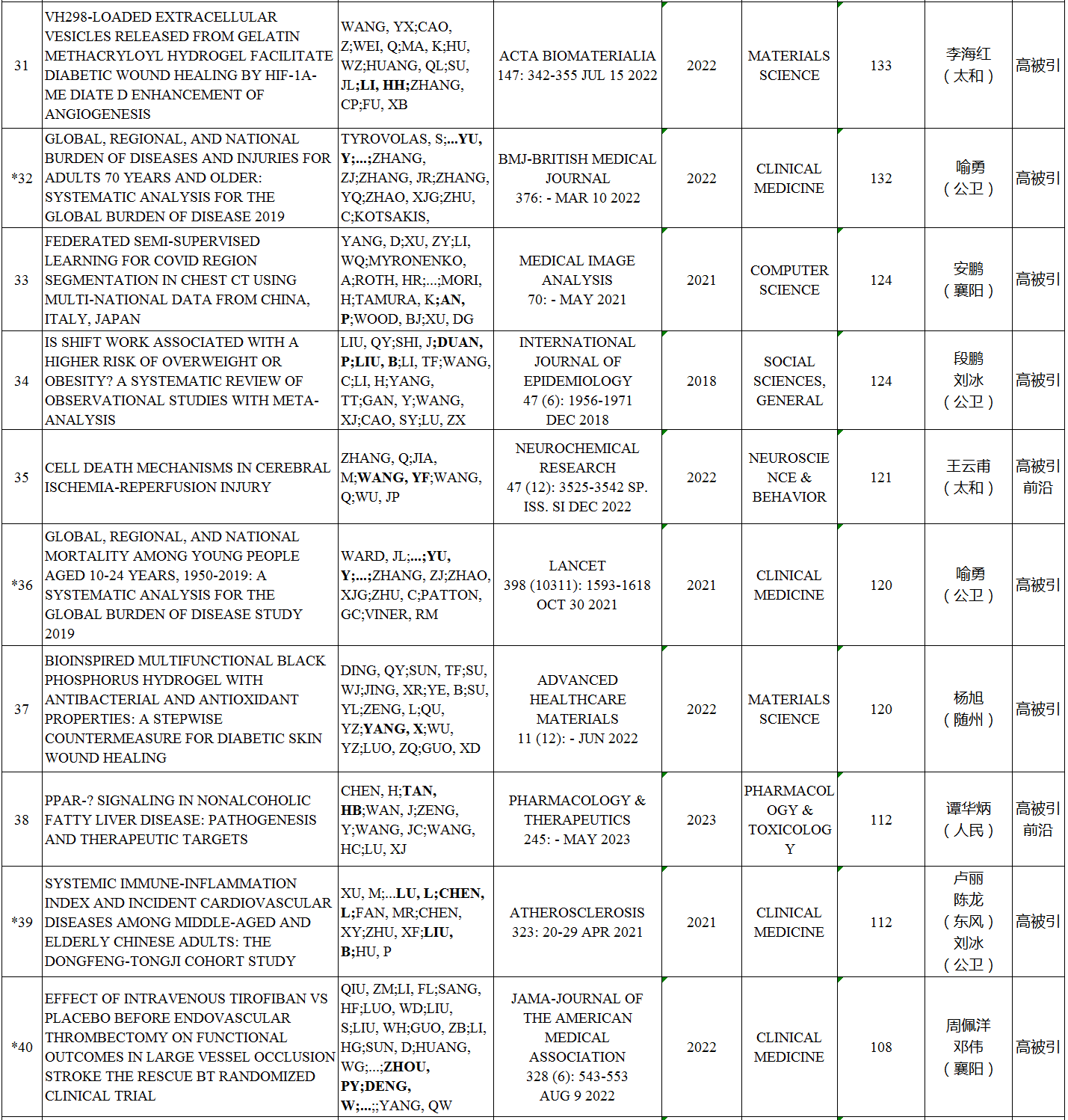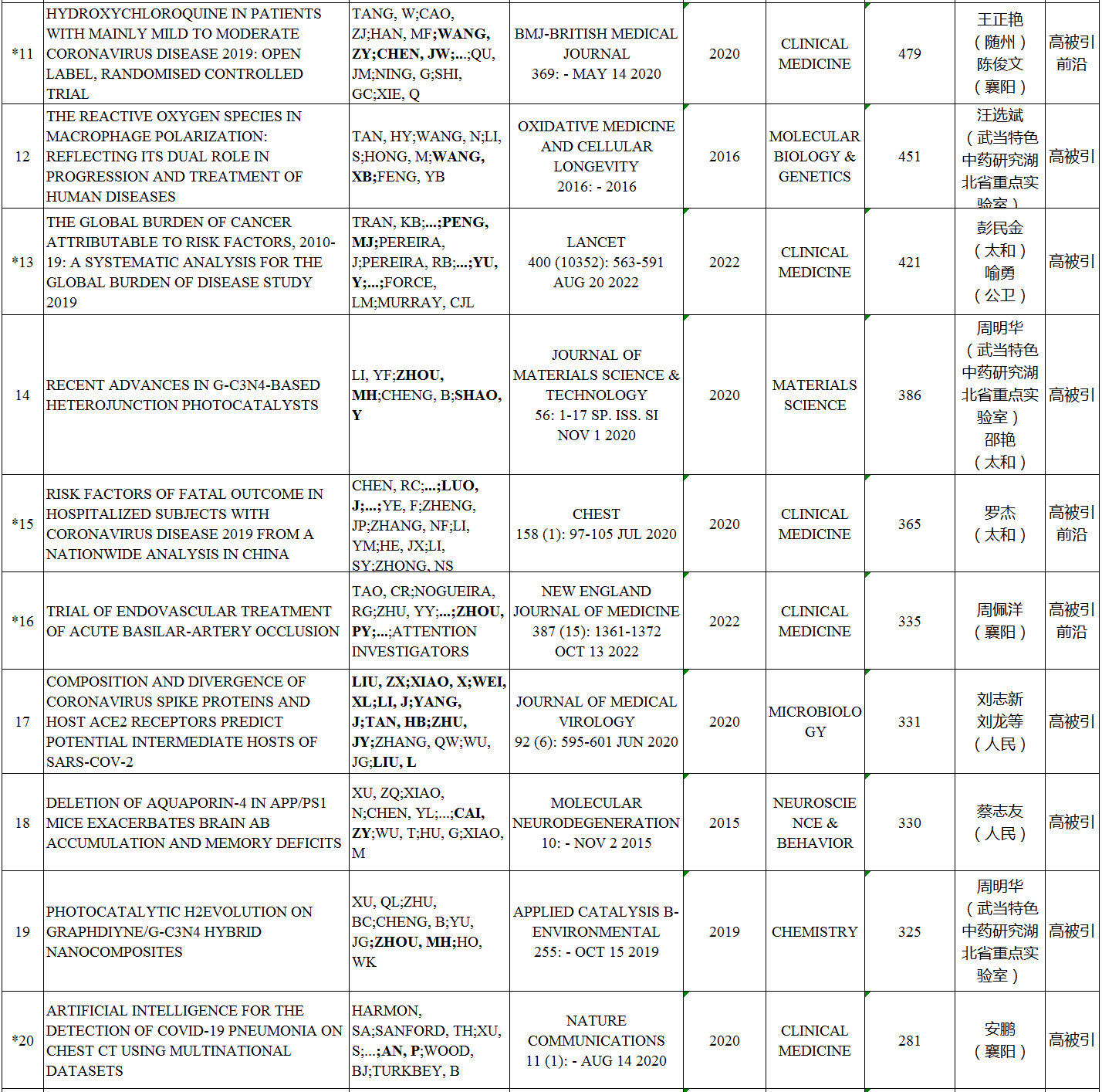 本期我校ESI高水平论文涉及10个ESI学科,共57篇。其中,高被引论文57篇,临床医学最多,为36篇,其次是材料科学,为4篇;热点论文6篇,临床医学5篇,神经系统科学与行为学1篇;研究前沿论文17篇,临床医学15篇,药理学与毒理学1篇,神经系统科学与行为学1篇。如下所示:
