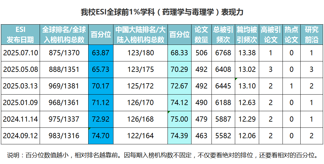 本期,药理学与毒理学全球入榜机构总数1370个,我校排名875,与上期相比上升13位,排名百分位较上期上升1.86%;中国大陆入榜机构总数180个,我校排名123,与上期持平,排名百分位较上期上升1.96%。被ESI收录的论文总数为506篇(Web of Science核心合集的SCI-E/SSCI中收录的上述时间范围内ARTICLE和REVIEW类型的论文数),被引频次总计6768次(在Web of Science核心合集的 SCI-E/SSCI/A&HCI中的被引用次数),篇均被引频次13.38,高水平论文1篇。其中,高被引论文1篇,热点论文0篇,研究前沿论文1篇。表现力如下所示: