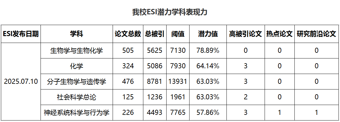 对于尚未进入ESI全球前1%的学科,结合ESI与InCites的数据,应用合理的算法预测其潜力值,对学科规划与发展非常重要。只有潜力值超过100%时,才有可能进入ESI,潜力值越大希望越大。根据ESI 2025年7月、InCites 2025年6月的最新数据,本期我校还未进入ESI全球前1%的学科中,潜力值排名较靠前的5个学科为:生物学与生物化学(本期78.89%,上期77.73%)、化学(本期64.14%,上期62.65%)、分子生物学与遗传学(本期63.03%,上期60.66%)、社会科学总论(本期63.03%,上期60.84%、神经系统科学与行为学(本期57.86%,上期56.29%)。表现力如下所示: