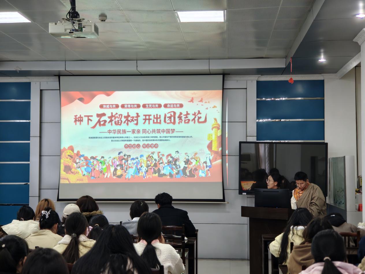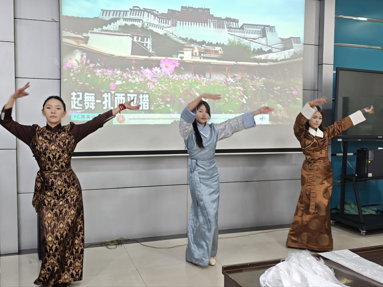 活动伊始,主持人详细介绍了活动背景与流程,强调了多民族文化共生共荣的重要意义,为整场活动奠定了温暖包容的基调。拉珍以“文化传承与生活习俗”为核心,她从藏族历史发源、高原特色文化地标、唐卡、舞蹈、手工艺等方面来讲述。从酥油茶、青稞酒、糌粑等特色饮食入手,讲解了藏族人民适应高原气候的饮食习惯文化。在服饰与节气风情分享中,她展示了卫藏、康巴、安多等不同地区服饰的独特风格,细致介绍了藏历新年“切玛祈福”、雪顿节藏戏展演、望果节绕田祈福等传统节庆的庆祝方式。格桑卓玛则聚焦“藏文化衍生价值与载体”,带大家领略藏族文化的深厚底蕴与时代活力。她重点介绍了藏医,讲解了藏医与中医交融互补的发展现状,以及《四部医典》数字化传承的创新实践,让同学们了解到传统医学为藏族同胞提供生命保障。藏文中乌金体的刚劲挺拔、乌梅体的圆润柔和,让大家感受到了藏文书法的艺术魅力。布达拉宫的宏伟庄严、碉楼与帐篷的实用智慧,展现了藏式建筑的特色。此外,她还分享了尼木藏香、藏纸等非遗技艺的传承故事,让同学们看到传统文化的当代新活力。活动现场,藏族同学们热情洋溢地跳起了民族舞蹈,将现场氛围推向了高潮。