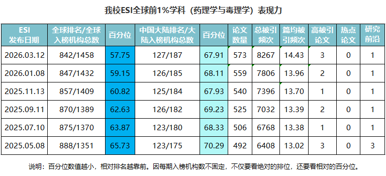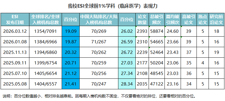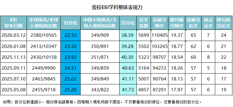2026年3月12日发布的最新一期ESI数据显示,本期全球入榜机构总数10565个,我校排名2380,与上期相比上升33位,排名百分位较上期上升0.79%;中国大陆入榜机构总数909个,我校排名349,与上期相比上升1位,排名百分位较上期上升0.89%。