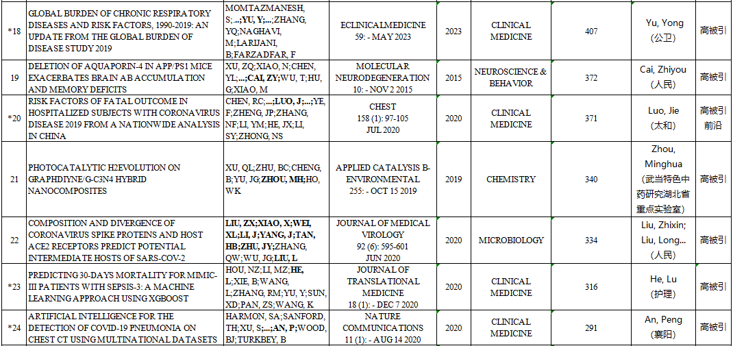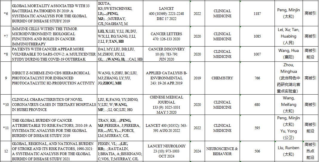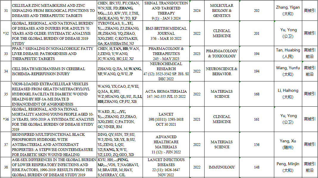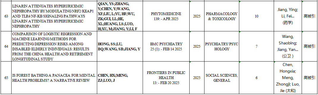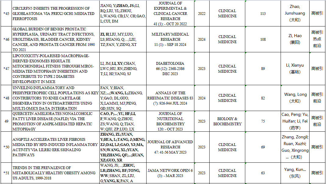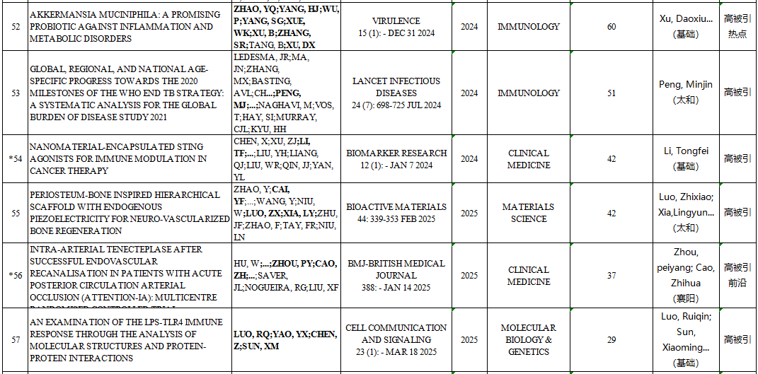 本期我校ESI高水平论文涉及12个ESI学科,共65篇。其中,高被引论文65篇,临床医学最多,为39篇,其次是分子生物学与遗传学,为5篇;热点论文7篇,临床医学5篇,神经系统科学与行为学、免疫学,各1篇;研究前沿论文24篇,临床医学18篇,神经系统科学与行为学2篇,药理学与毒理学、分子生物学与遗传学、免疫学、生物学与生物化学,各1篇。如下所示: