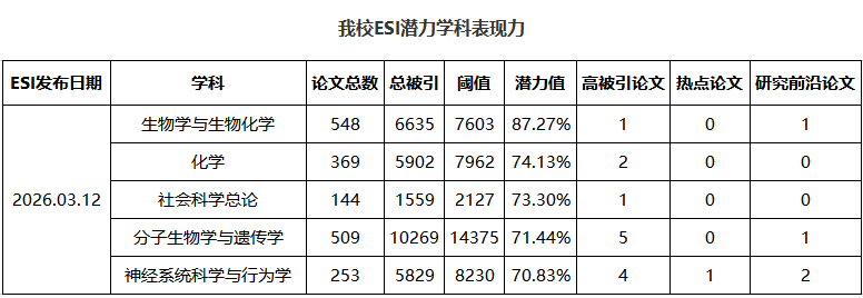 对于尚未进入ESI全球前1%的学科,结合ESI与InCites的数据,应用合理的算法预测其潜力值,对学科规划与发展非常重要。只有潜力值超过100%时,才有可能进入ESI,潜力值越大希望越大。根据ESI 2026年3月、InCites 2026年2月的最新数据,本期我校还未进入ESI全球前1%的学科中,潜力值排名较靠前的5个学科为:生物学与生物化学(本期87.27%,上期85.14%)、化学(本期74.13%,上期71.34%)、社会科学总论(本期73.30%,上期69.61%)、分子生物学与遗传学(本期71.44%,上期69.51%)、神经系统科学与行为学(本期70.83%,上期68.01%)。表现力如下所示: