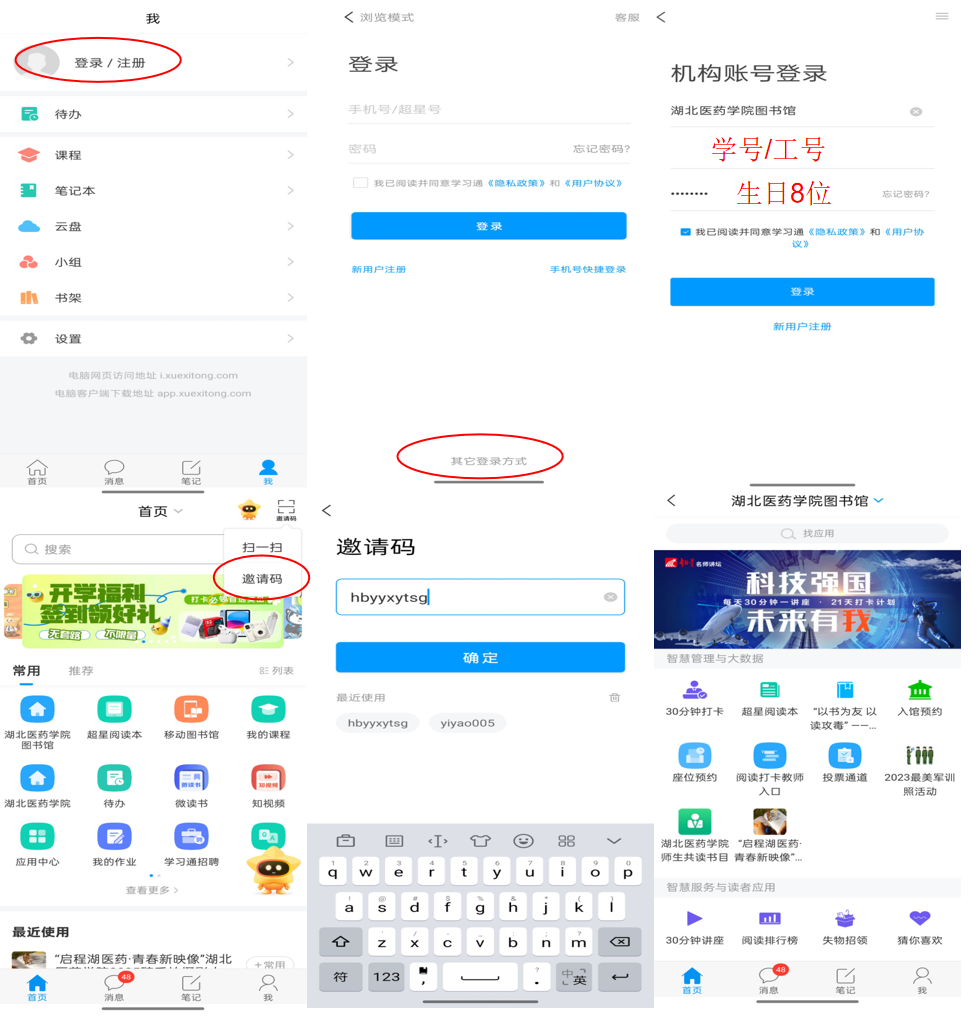 五、部分数据库提供手机APP,如:超星学习通、万方数据、全球学术快报(中国知网)等。超星学习通使用方式如下: